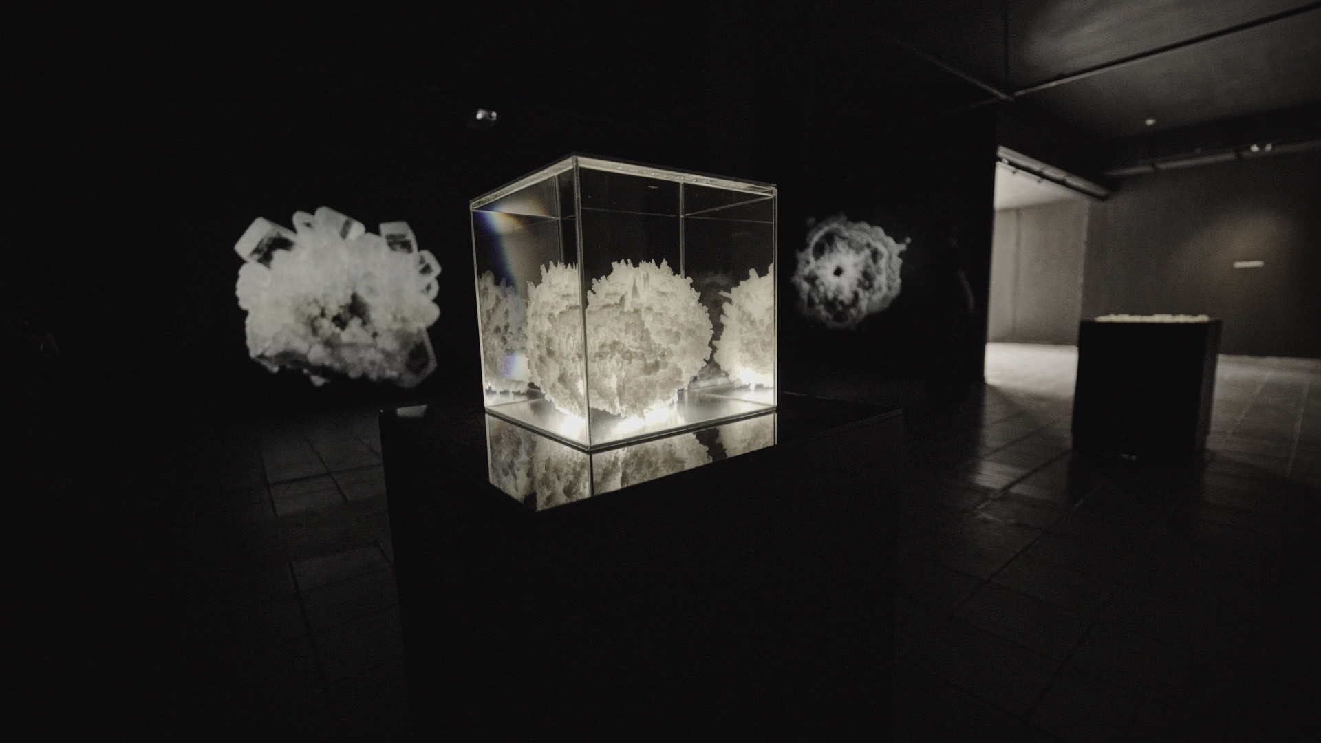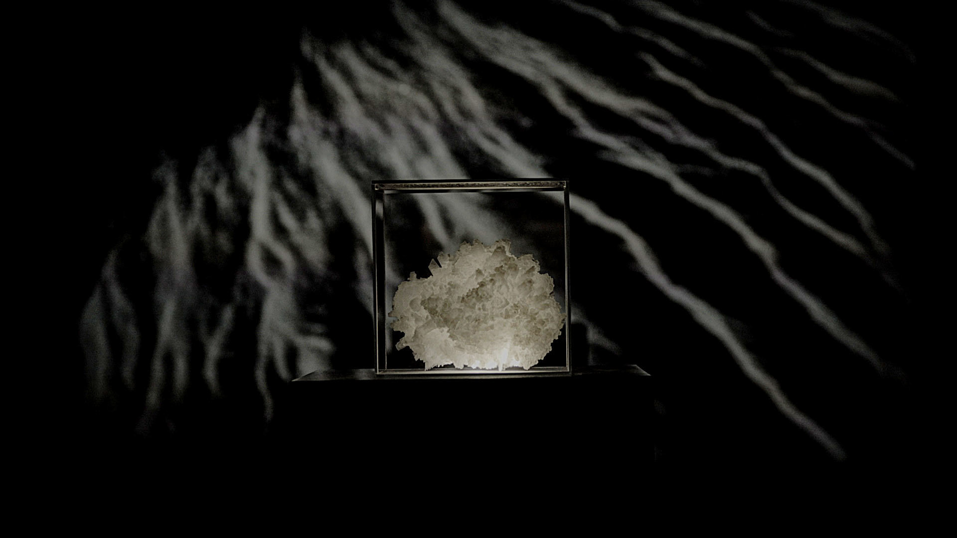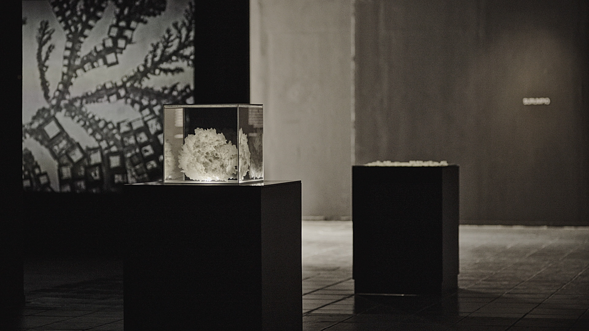 Surumpio, palabra quechua que nombra la ceguera provocada por el reflejo del sol en los salares, se propone como una instalación audiovisual híbrida que pone en diálogo la imagen en movimiento y la luz proyectada sobre un cúmulo de cristales de sal. La sala se vuelve espacio practicado para reflexionar sobre la noción de paisaje y el acto de percepción corporal, temporal y geológica. Este elemento de la naturaleza, proveniente de otras geografías, confluye en el espacio de arte y se presenta integrando una construcción híbrida y artificial que disloca la idea del salar en la mirada y el desplazamiento del visitante a través de tecnofósiles. Cristal, agua, viento, huesos, piedras; un viaje iniciático de la artista por un organismo mineral reimaginado.